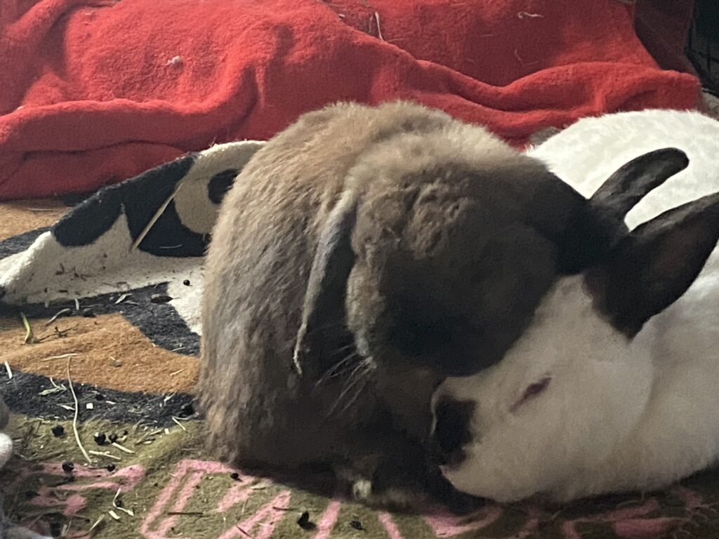 Blind without his partner, Puff came to live in the upstairs studio with four other Rabbits who also have significant health issues. pierre Michel, having been rescued from a torture ring, suffered from multiple breaks in his back. Looking at the x-ray and shaking his head, the doctor said he had never seen damage as severe as pierre Michel’s. The doctor marveled that pierre Michel could even walk let alone hop. But he did and for many years ran around the Habitat enjoying life and even digging burrows. But when his partner, Calais, had a stroke, the two were moved into the studio where another pair of Rabbits, Antoine and Etienne, lived. After sustaining two strokes, Antoine was not ambulatory. Etienne, his brother, had periodic seizures which left him slightly paralyzed in an arm and a leg. True to form, The Puff immediately stepped in and became chief carer. He was ever so loving, gentle, and thoughtful, talking, nuzzling and grooming each one. The change brought on by his blindness, however, started a rapid decline.