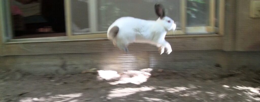Just one look was all it took…I don’t know whether it was my activist friend’s warning, “Whatever you do, don’t look at Craigslist,” which unconsciously provoked me to do so, but I did and who appeared almost instantly were two Rabbits, one white, the other black, their backs pressed up against the farthest reaches of a tiny outdoor cage. The white one was staring directly at the camera, and therefore, directly into my eyes. His eyes spoke intelligent apprehension. There was no hesitation. Within hours, they had come home here, away from the brutality of backyard farming.